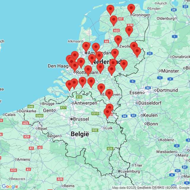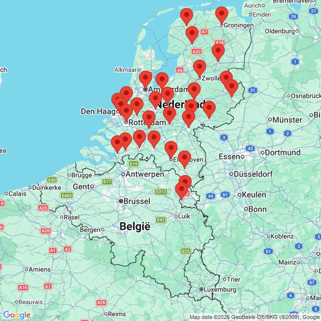 Almelo, Almere, Amersfoort, Amsterdam, Apeldoorn, Arnhem, Bergen op Zoom, Beek-Elsloo, Breda, Delft, Den Bosch, Den Haag, Doetinchem, Eindhoven, Enschede, Gorinchem, Gouda, Groningen, Heerenveen, Heerlen, Hengelo, Hoogeveen, Leeuwarden, Leiden, Maastricht, Nederweert, Nijmegen, Roosendaal, Rotterdam, Tiel, Tilburg, Utrecht of Zwolle.