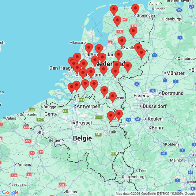 Almelo, Almere, Amersfoort, Amsterdam, Apeldoorn, Arnhem, Bergen op Zoom, Breda, Delft, Den Bosch, Den Haag, Doetinchem, Dordrecht, Eindhoven, Gorinchem, Gouda, Groningen, Heerenveen, Heerlen, Hengelo, Hoogeveen, Leeuwarden, Leiden, Maastricht, Nederweert, Nijmegen, Roosendaal, Rotterdam, Stein-Urmond, Tiel, Tilburg, Utrecht of Zwolle.