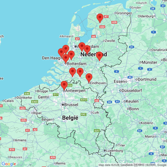 Je kunt kiezen uit de volgende regio's: Amersfoort, regio Arnhem, regio Breda, regio Den Haag, regio Eindhoven, regio Gouda, regio Heerenveen, regio Hilversum, regio Leiden, regio Rotterdam, regio Tilburg en regio Antwerpen (België).
