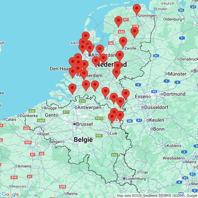 Amersfoort, Amsterdam, Apeldoorn, Arnhem, Bergen op Zoom, Beverwijk, Breda, Den Bosch, Den Haag, Dordrecht, Eindhoven, Gouda, Groningen, Haarlem, Heerenveen, Hoogeveen, Leiden, Nijmegen, Rotterdam, Spijkenisse, Tilburg, Utrecht, Zoetermeer of Zwolle.