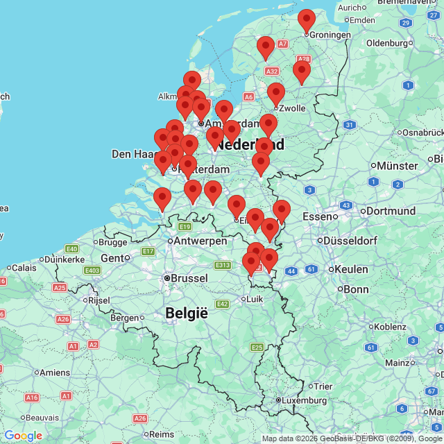 Alkmaar, Almere, Amersfoort, Amsterdam, Apeldoorn, Arnhem, Beek-Elsloo, Bergen op Zoom, Beverwijk, Breda, Den Bosch, Den Haag, Dordrecht, Echt, Eindhoven, Gouda, Groningen, Haarlem, Heerenveen, Heerlen, Hoogeveen, Leiden, Maastricht, Nederweert, Nijmegen, Roermond, Rotterdam, Spijkenisse, Tilburg, Utrecht, Venlo, Zaandam, Zoetermeer of Zwolle.