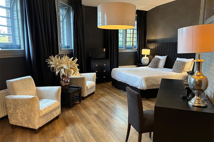 Hier en daar zie je nog originele deuren, baksteen- en traliewerk of historische elementen die subtiel terugkeren in de kamersfeer. Die combinatie van historie en hedendaagse luxe maakt je verblijf uniek en memorabel.