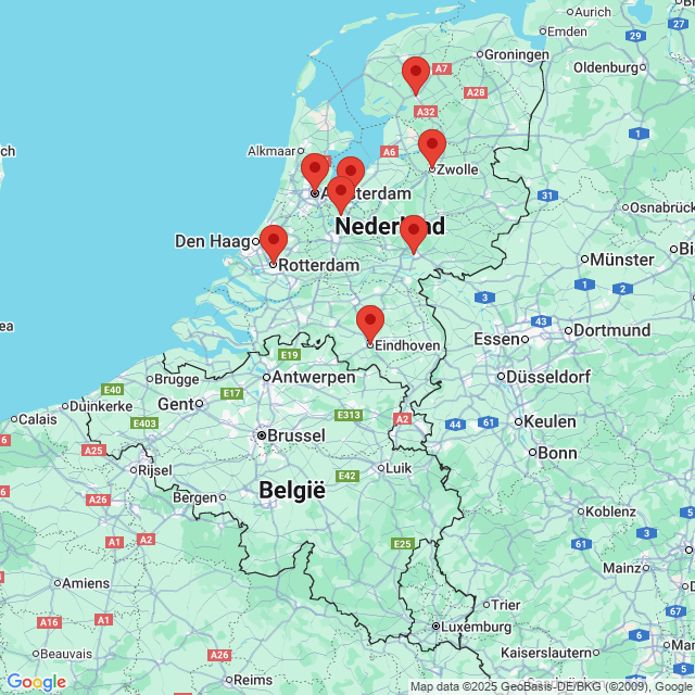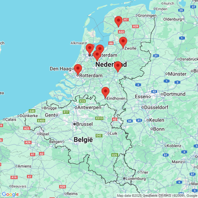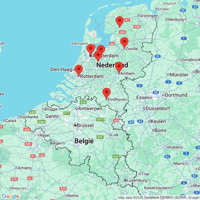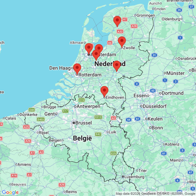 - Beschikbaar in Amsterdam, Arnhem, Breda, Eindhoven, Hilversum, Heerenveen, Rotterdam en Zwolle;